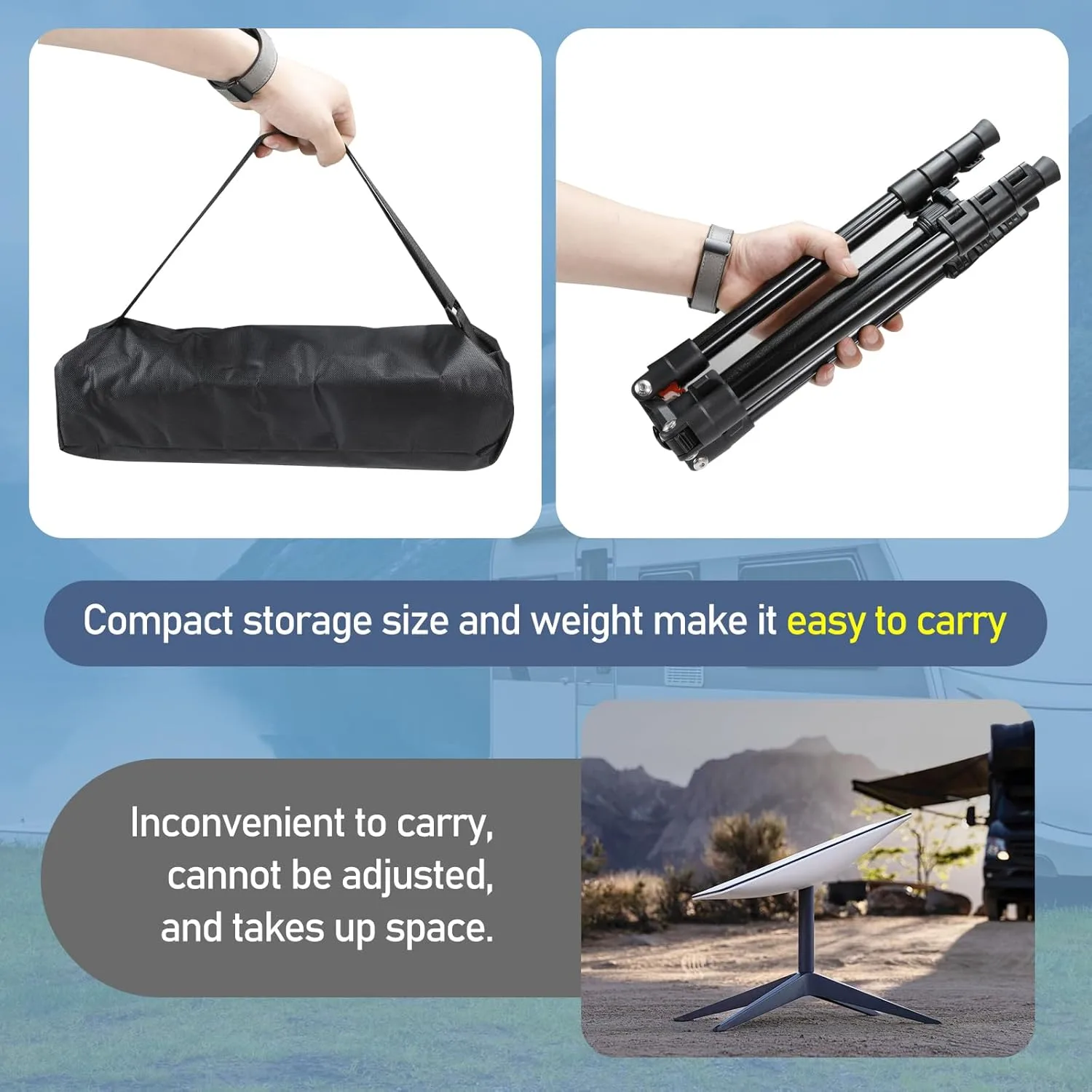 One of the most remarkable aspects of this tripod is its incredible adaptability and portability. Unlike bulky, rigid alternatives, this upgraded tripod boasts a knob-lock system that allows for rapid, tool-free height adjustments. In mere seconds, you can extend it from a compact 19 inches all the way up to an impressive 74 inches. This vast height range is crucial for adapting to diverse terrains – whether you’re setting up in a deep valley surrounded by trees or seeking a clear line of sight over a ridge. Its compact 19-inch storage size and feather-light 3.15 lbs weight make it an absolute dream for those on the move. Tossing it into an RV storage compartment, a car trunk, or even a large backpack becomes effortless, truly enabling a ‘connect anywhere’ lifestyle without the burden of heavy, cumbersome gear.